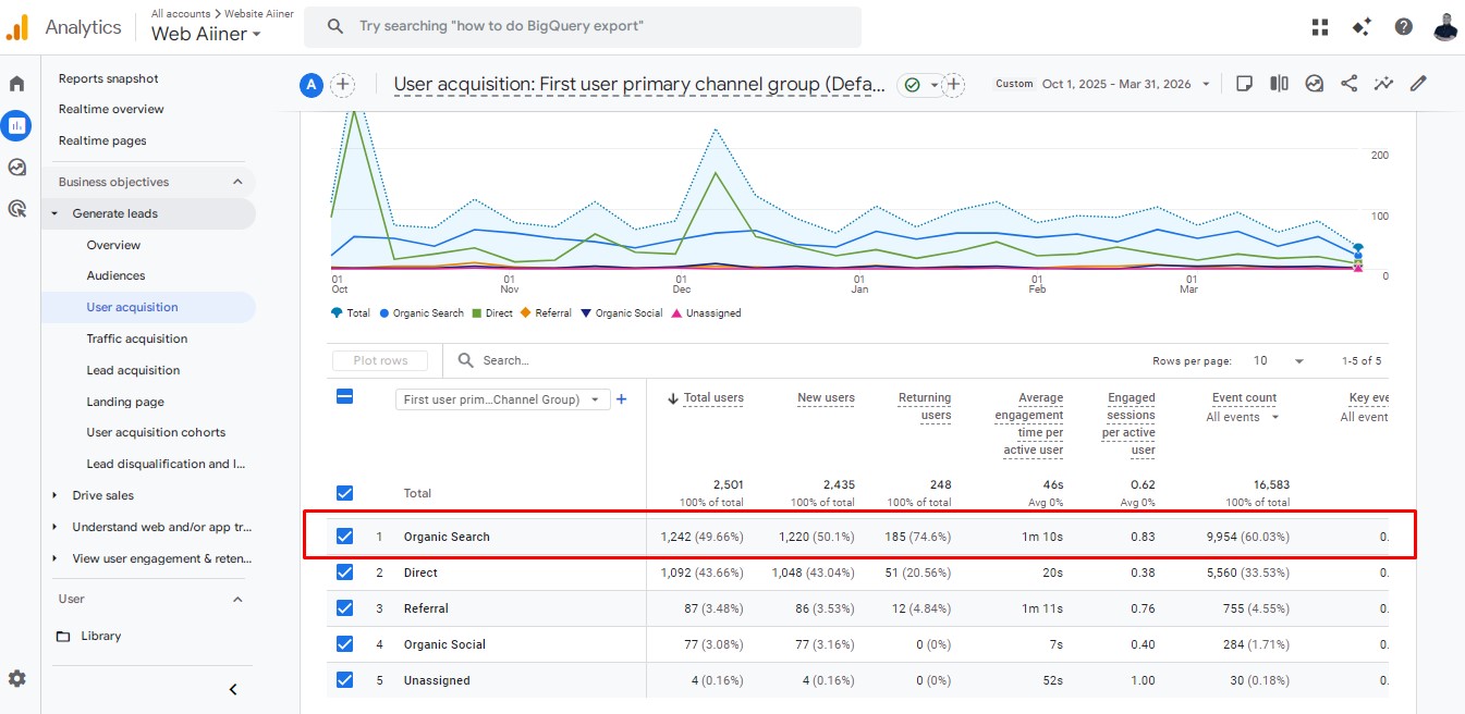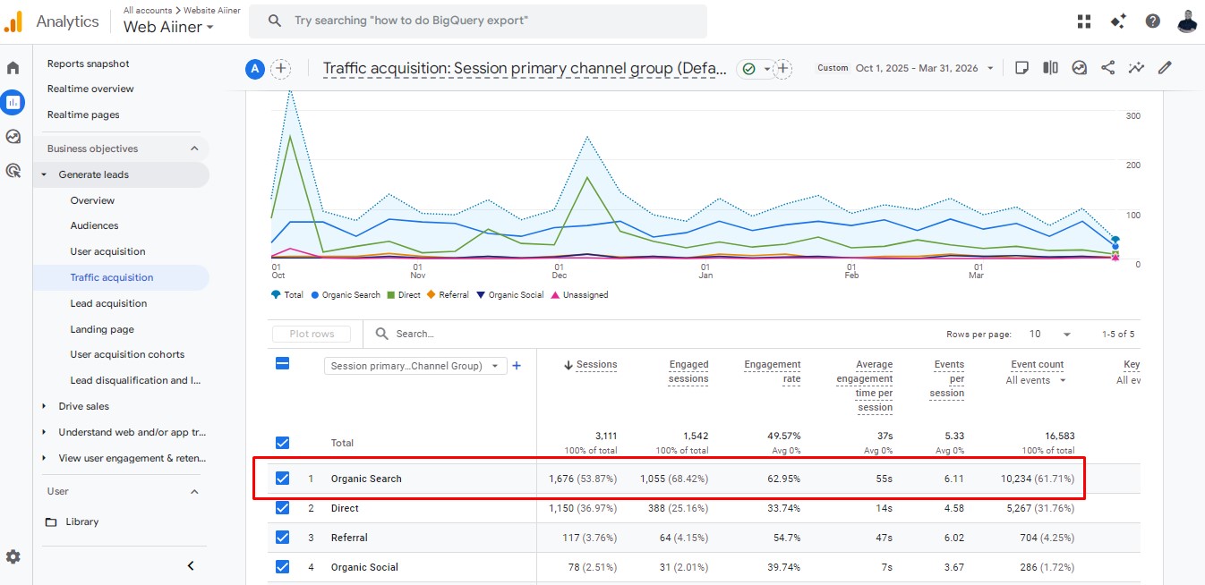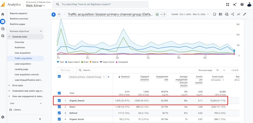 Gambar 2 – Google Analytics Report – Traffic Organic (Periode Oktober 2025 – Maret 2026)