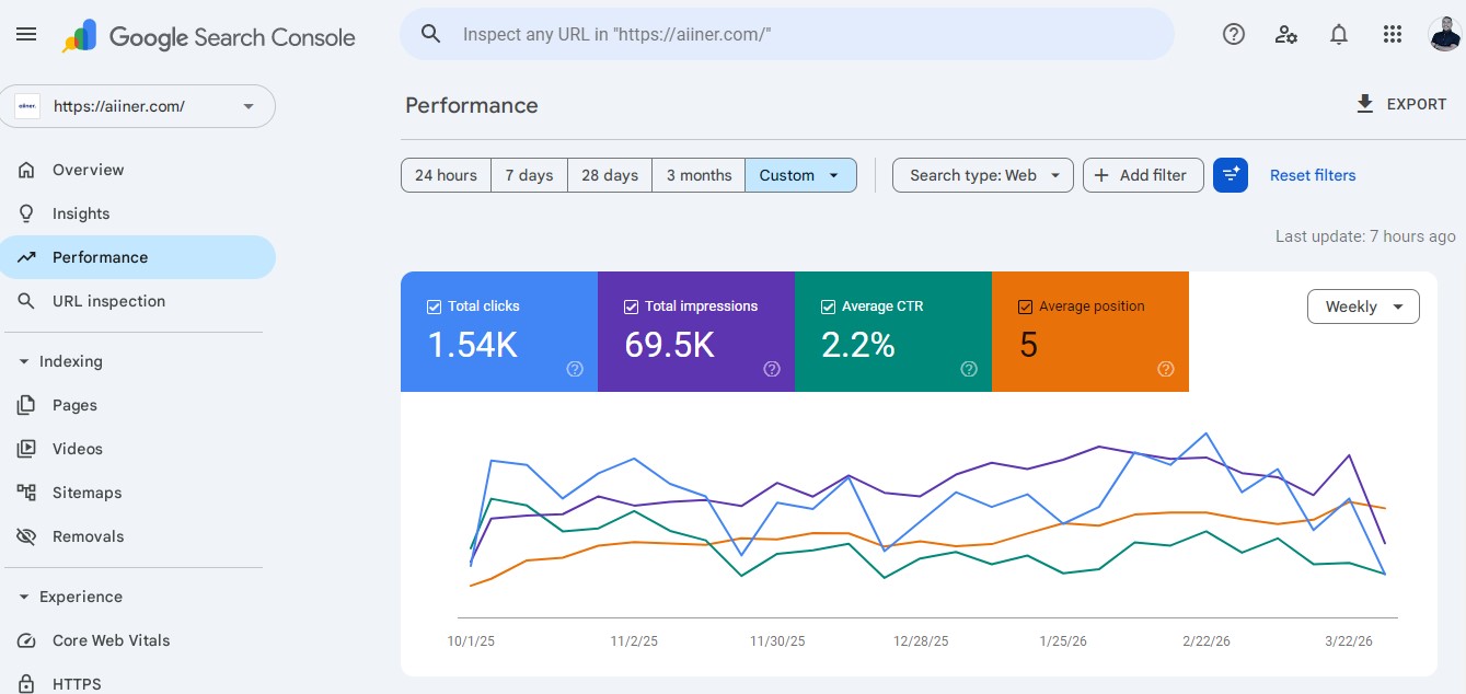 Gambar 1 – Google Search Console Performance (Periode Oktober 2025 – Maret 2026)