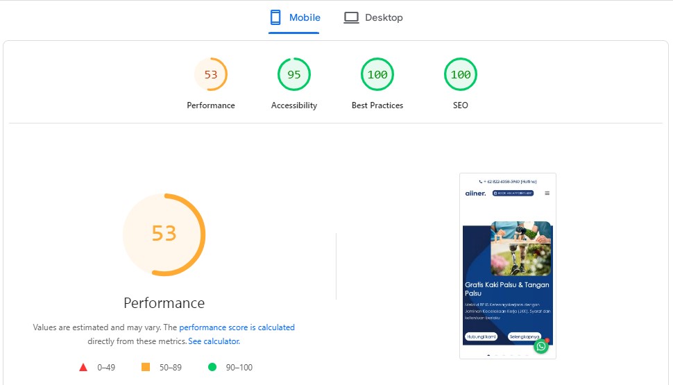 Hasil pengujian performa website menunjukkan kualitas optimasi teknis yang sangat baik, dengan skor SEO dan Best Practices mencapai 100 baik di desktop maupun mobile. Accessibility juga berada pada level tinggi (92–95), memastikan pengalaman pengguna yang inklusif dan optimal. Meskipun performa masih dalam tahap optimasi (Desktop: 72, Mobile: 53), struktur website telah dibangun dengan fondasi yang kuat dan siap untuk peningkatan lebih lanjut guna mencapai performa maksimal